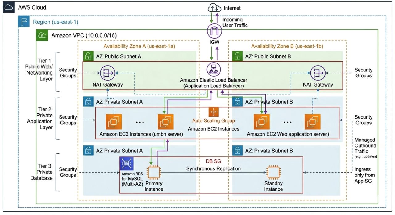 Entry: Traffic hits the 🎯 Application Load Balancer (ALB) (Layer 02) in the Public Subnet.